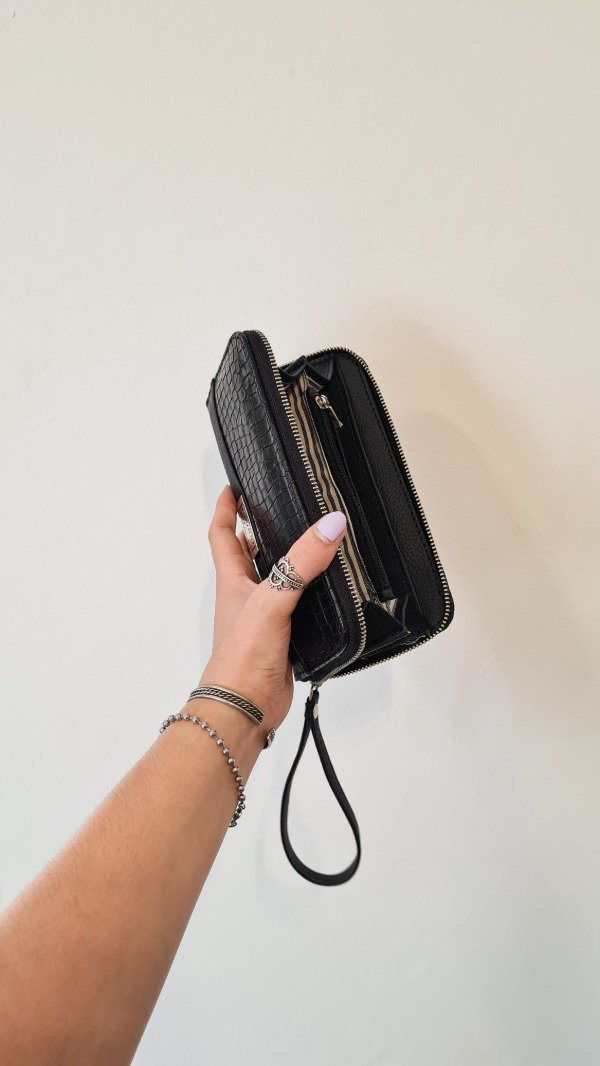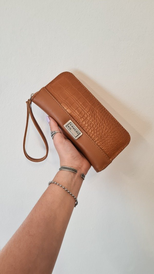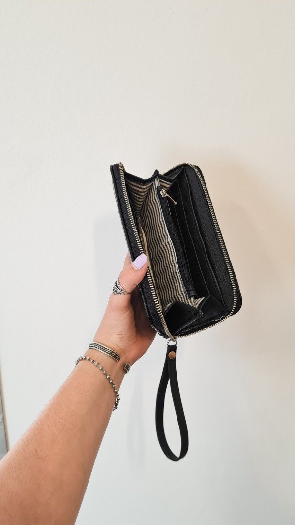 Cierre metálico de niquel YKK. En la parte interna posee un monedero con cierre. Espacio para 10 tarjetas. 3 secciones para billetes (2 entre monedero y tarjetero, 1 division especifica para billetes en el costado)
