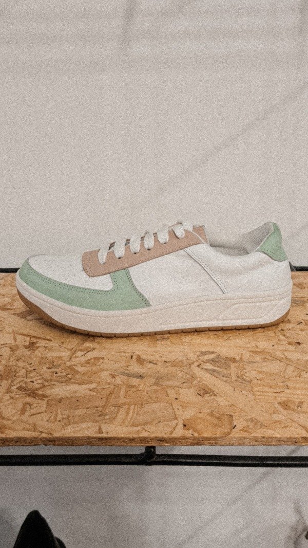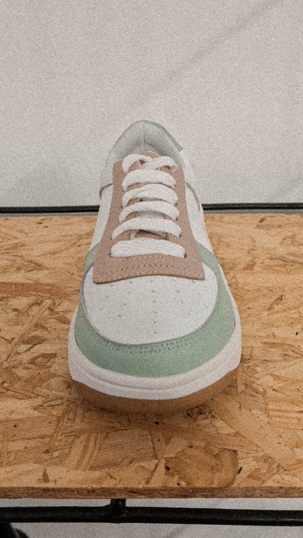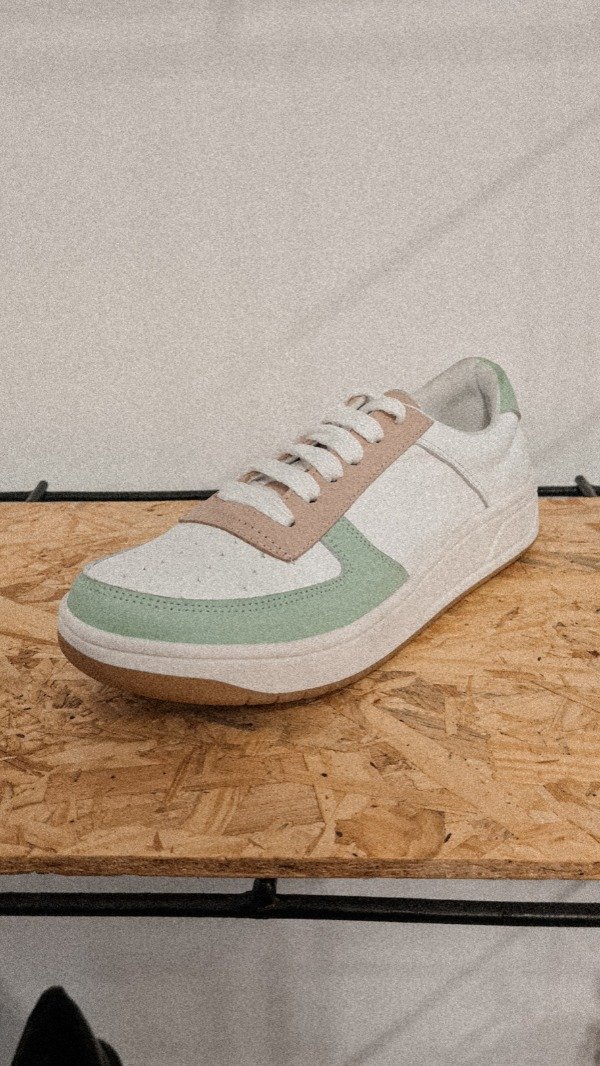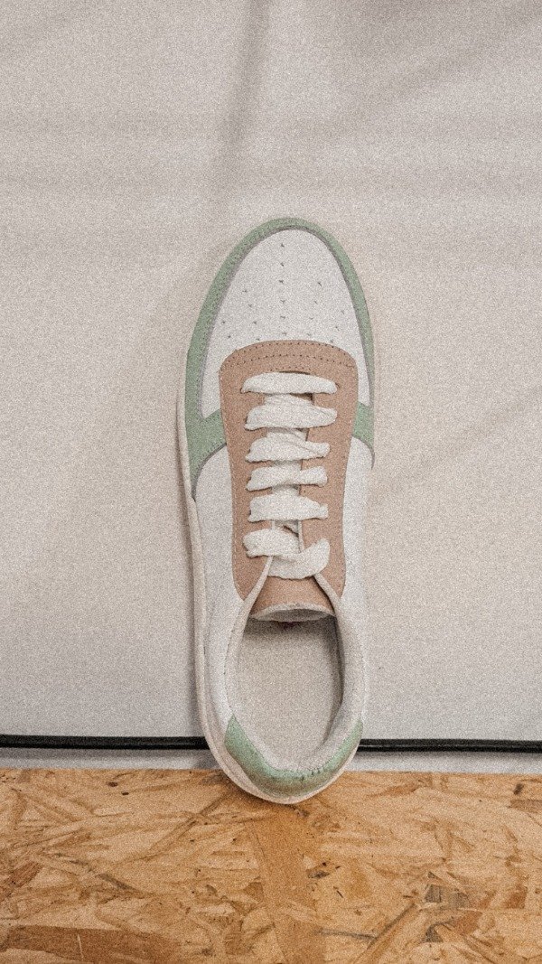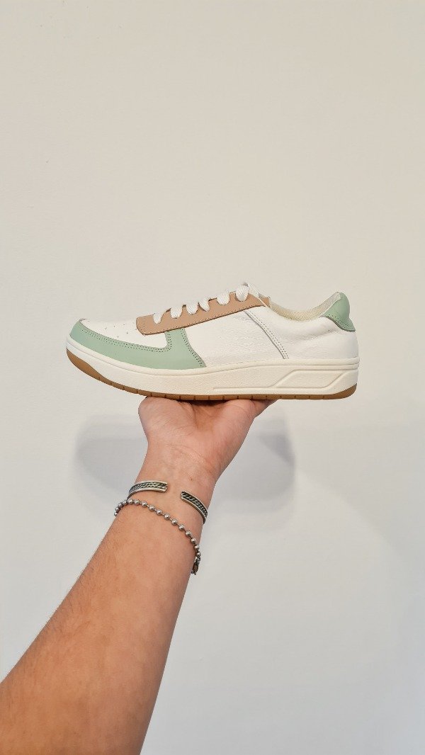 Zapatillas confeccionados en cuero blanco, verde y rosa. Forreria de microfibra acolchada. Base TR (goma) combinada crepe y blanco. Cordones de nylon.