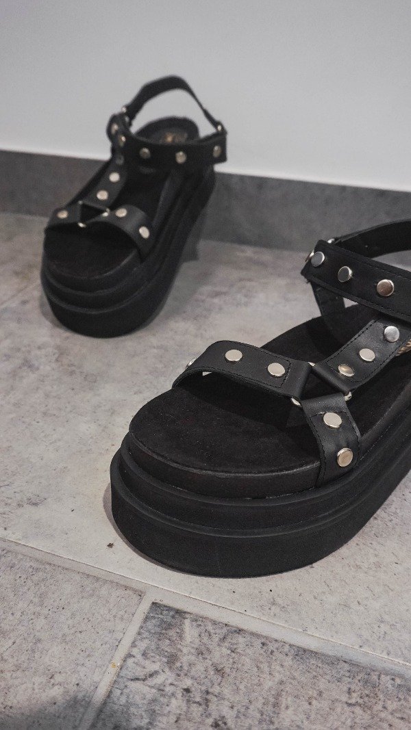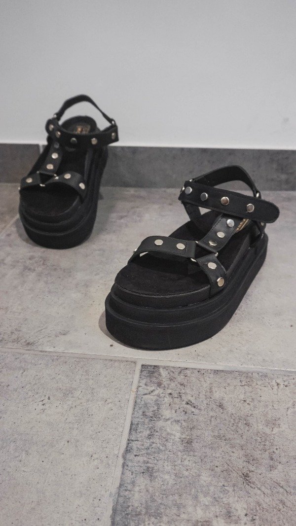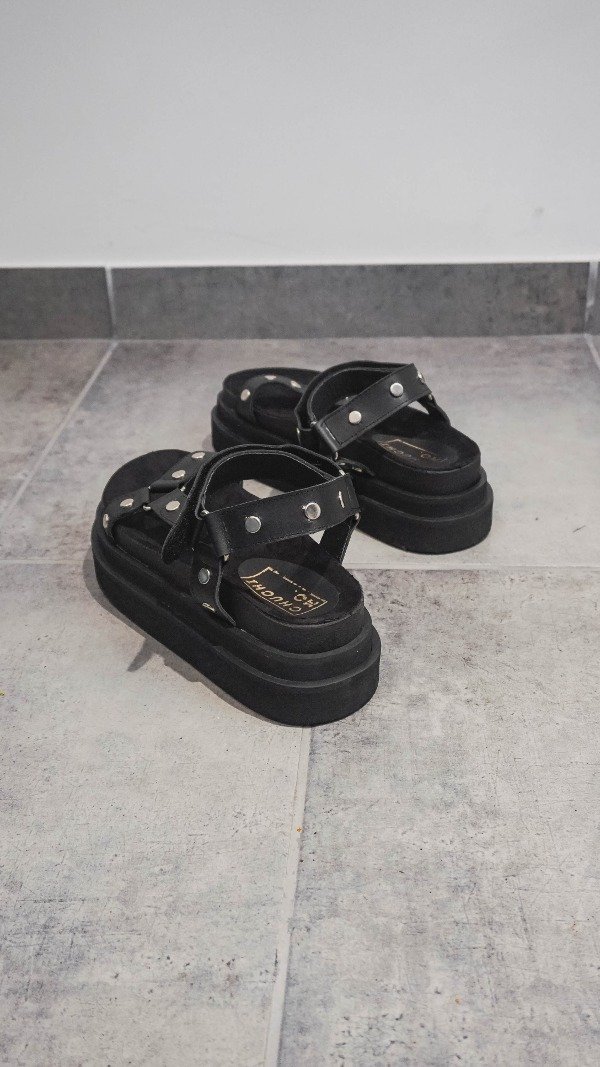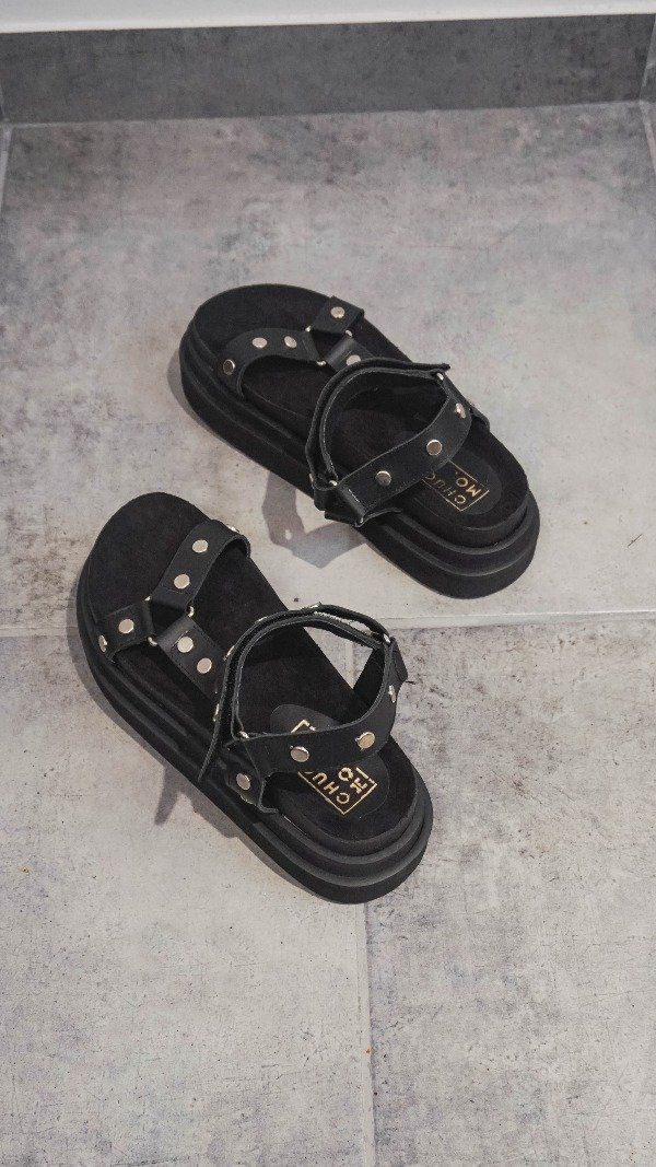 Sandalias realizadas en cuero vacuno. Apliques de niquel. Plataforma de eva artesanal. Horma normal. Se recomienda elegir talle habitual.