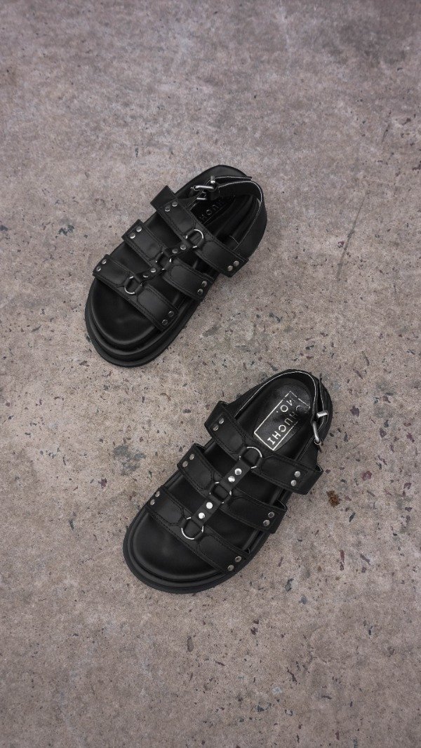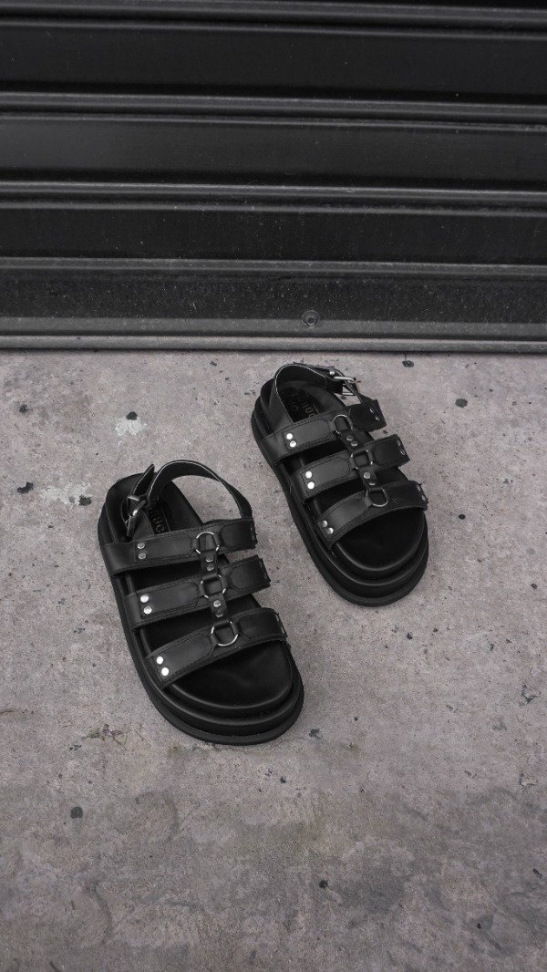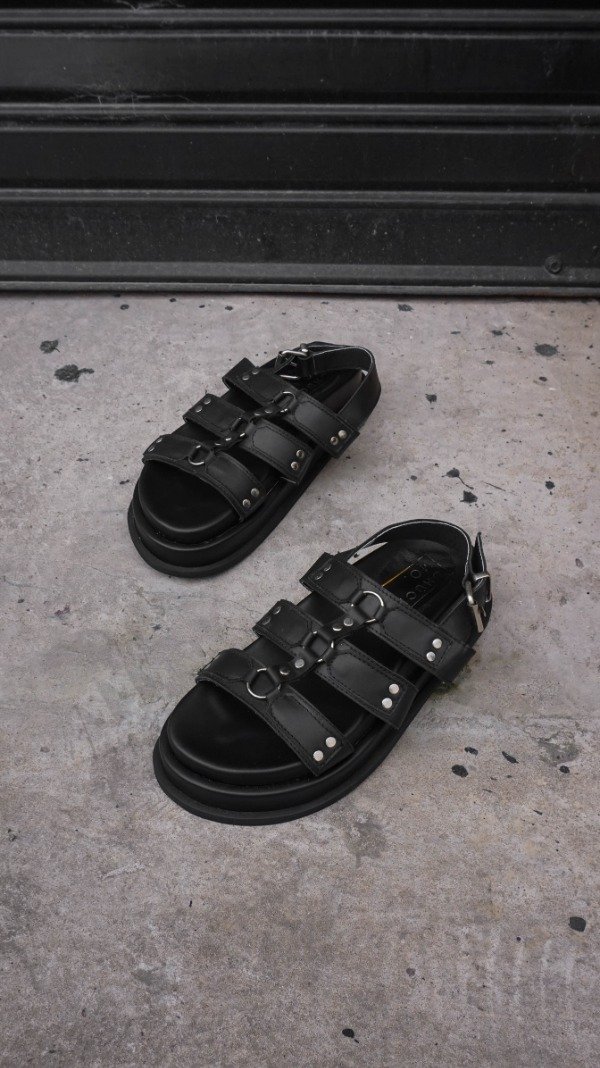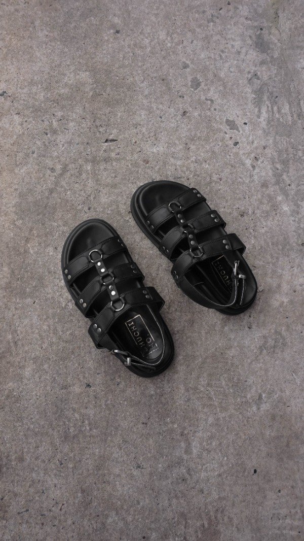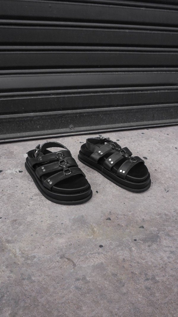 Sandalias realizadas en cuero vacuno. Apliques de niquel. Plataforma de eva artesanal. Horma normal. Se recomienda elegir talle habitual.
